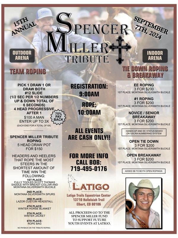 Team roping, tie-down roping and breakaway, food and prizes. Come enjoy the day honoring the memory of a wonderful young man while benefiting numerous activities at Latigo.